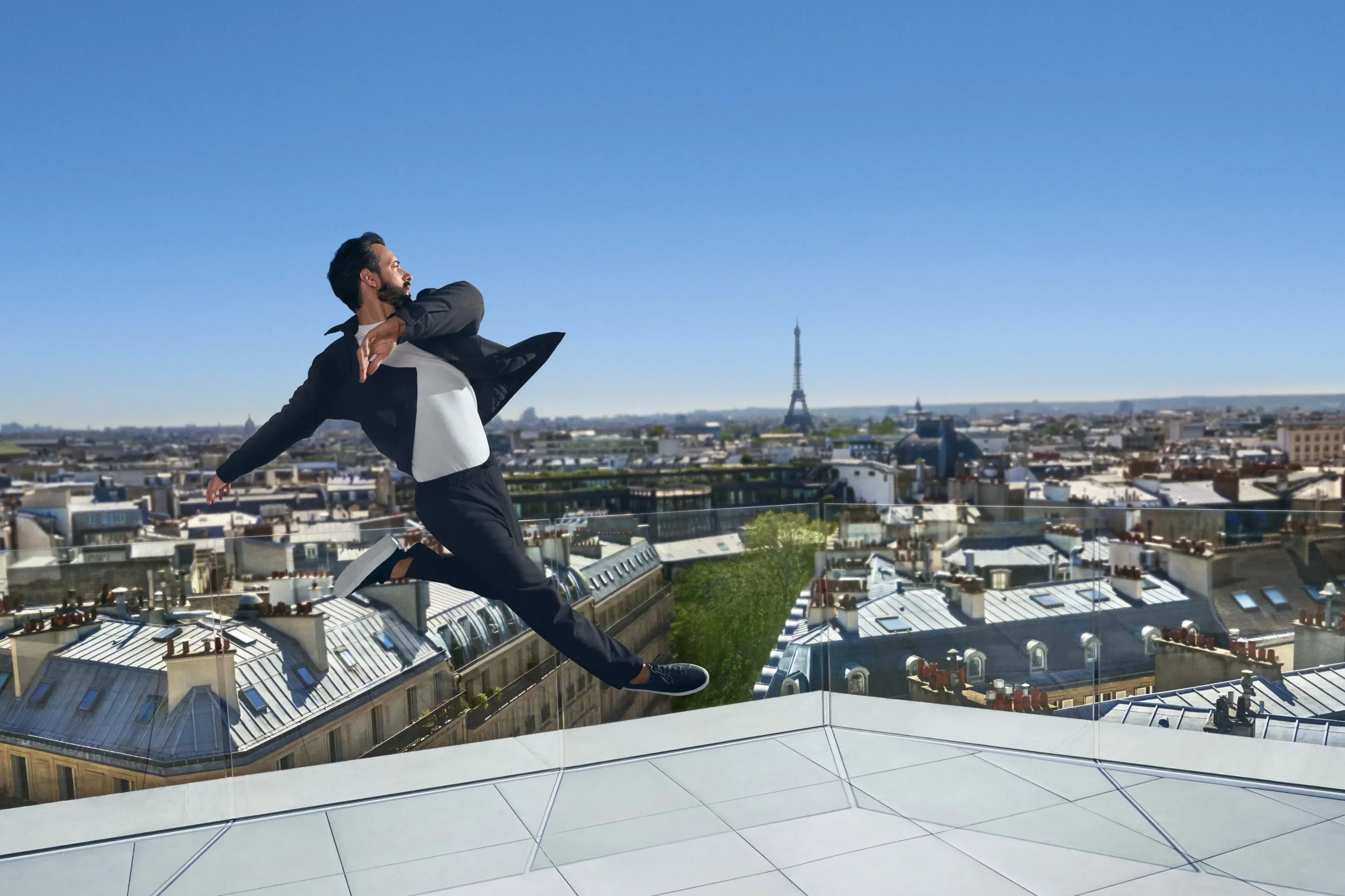 Poised on top of a building, seemingly suspended in the sky, Mathieu immediately grasped with the campaign’s intent.